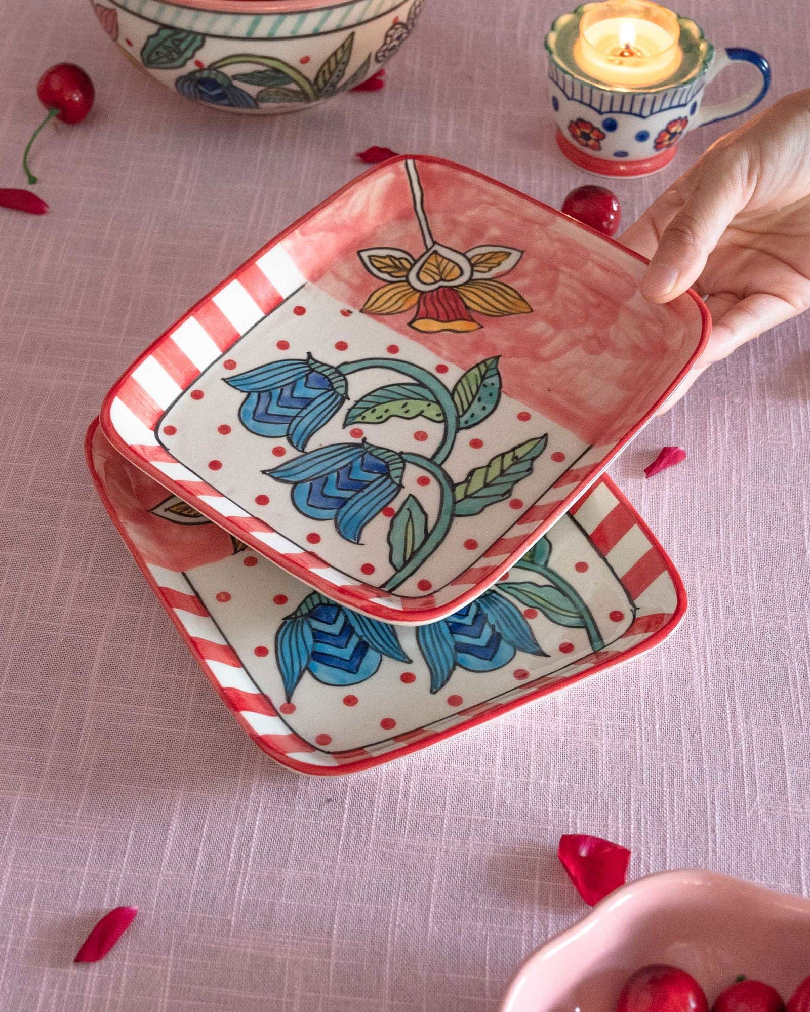 Product Description:?Set of 2 square ceramic plates with vibrant floral hand-painted design and bold striped border, perfect for serving snacks or desserts.