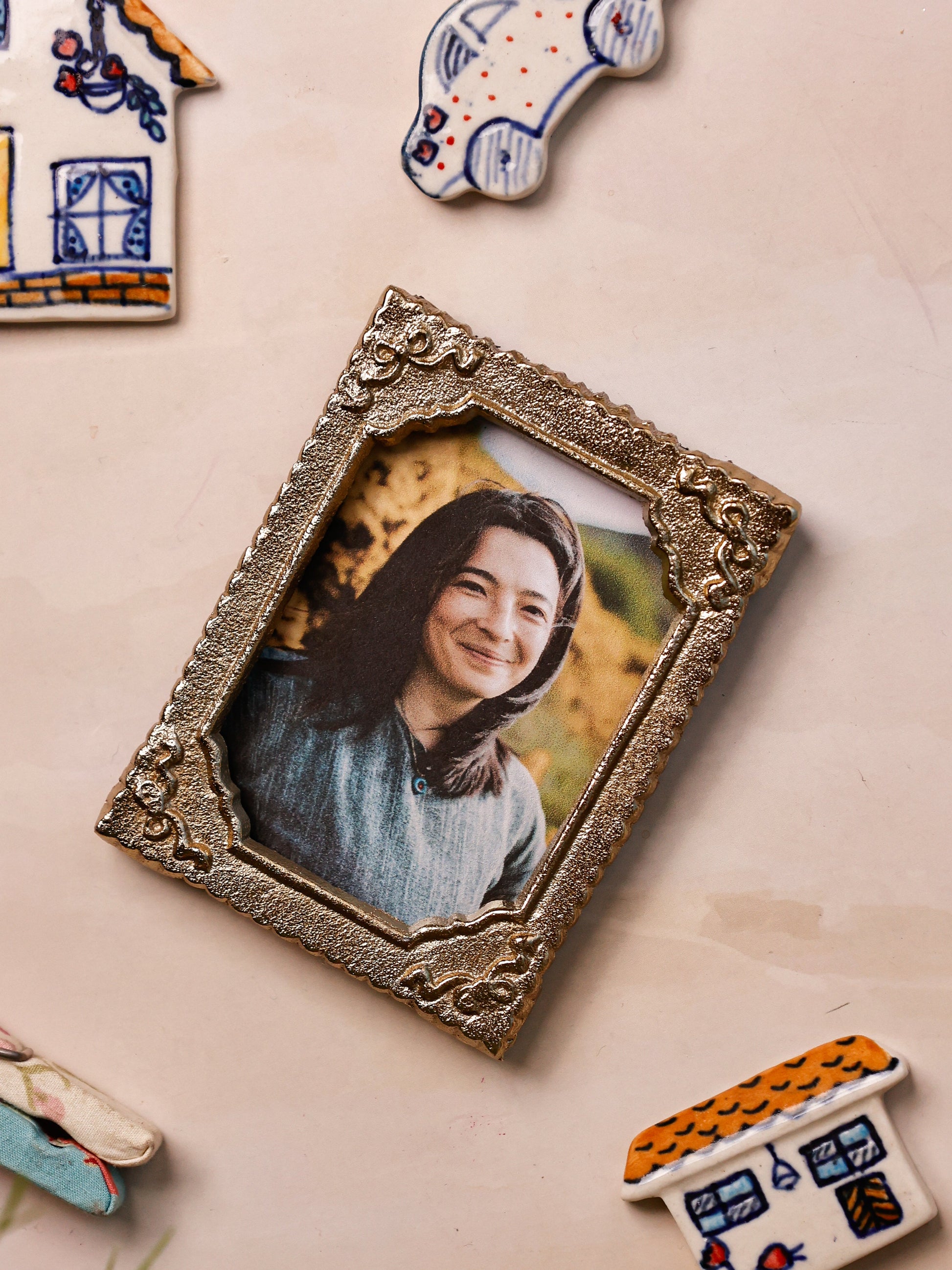 Product Description: A decorative fridge magnet with an elegant golden frame design, perfect for adding a touch of charm to your refrigerator or magnetic surfaces.