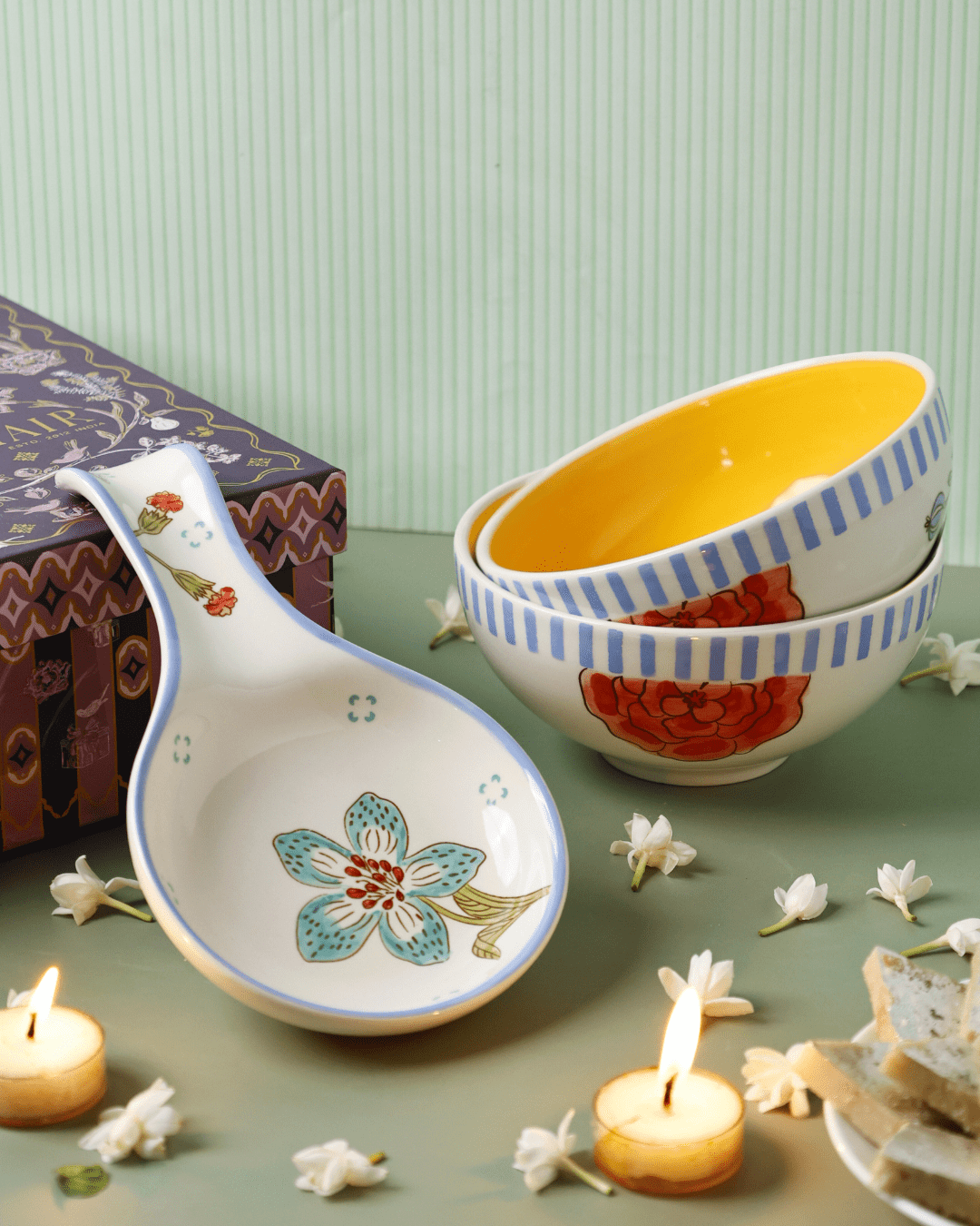 Product Description: Beautifully crafted with floral motifs and striped detailing, this set adds charm to your dining and kitchen space while serving with elegance.