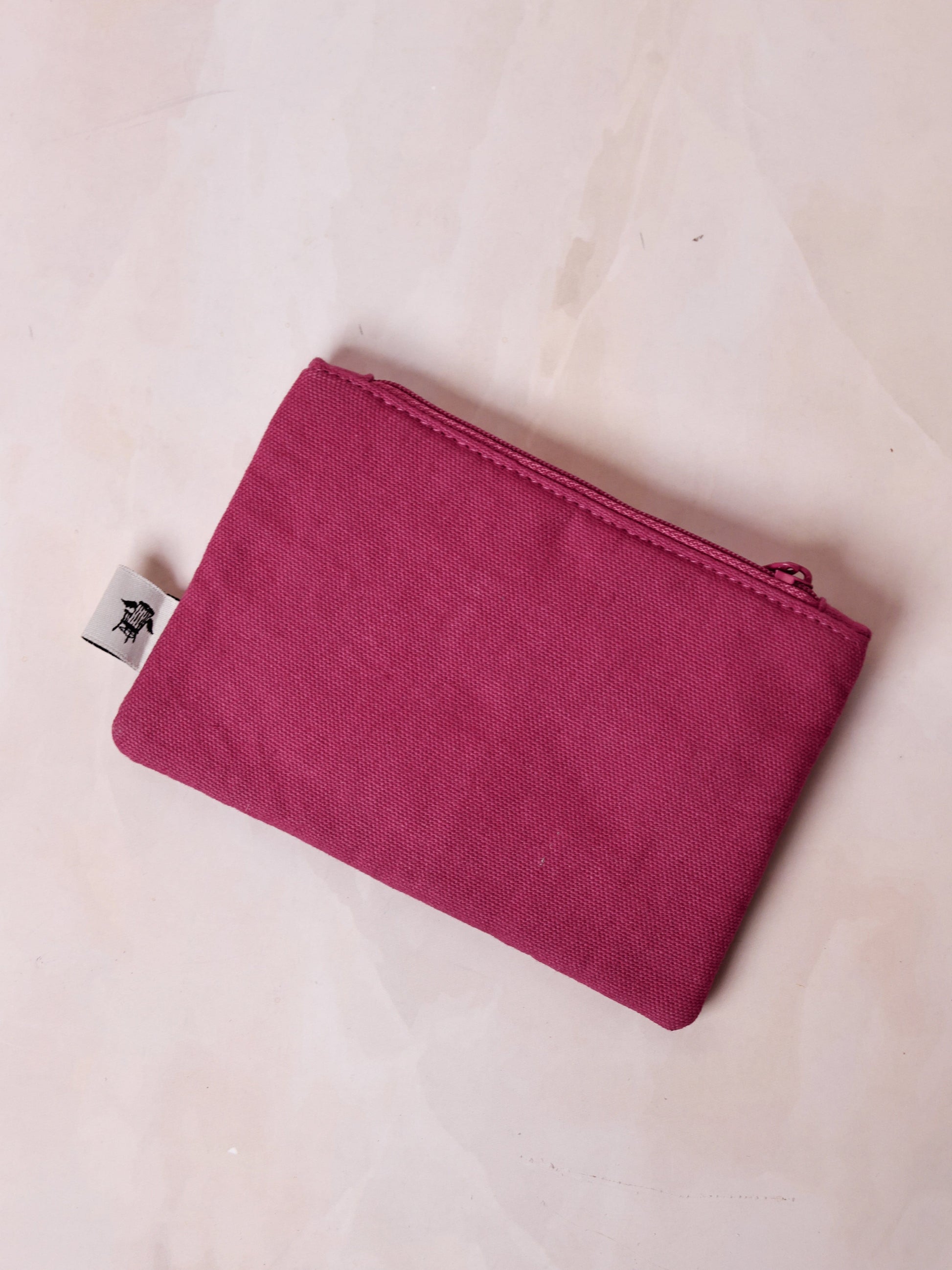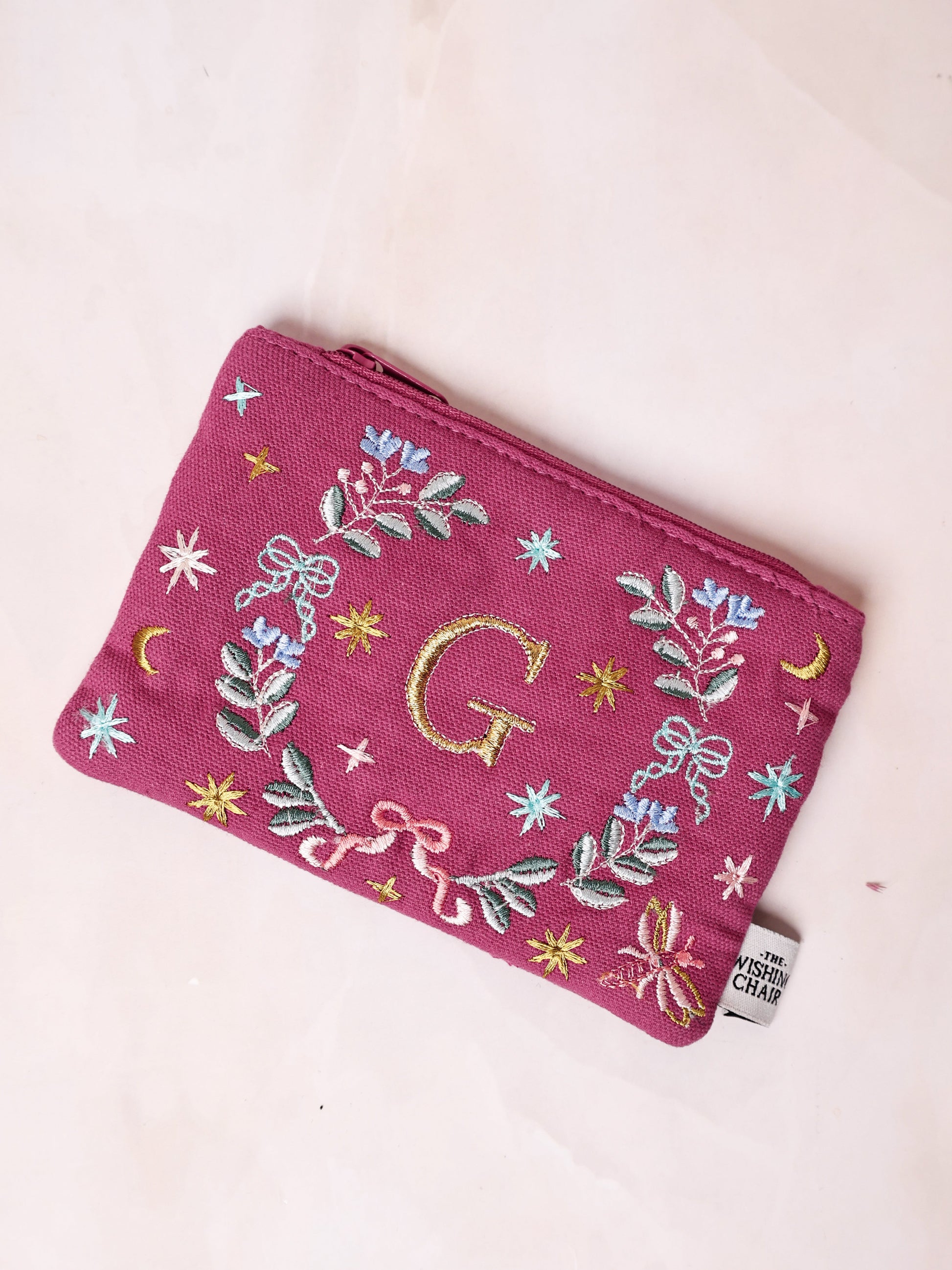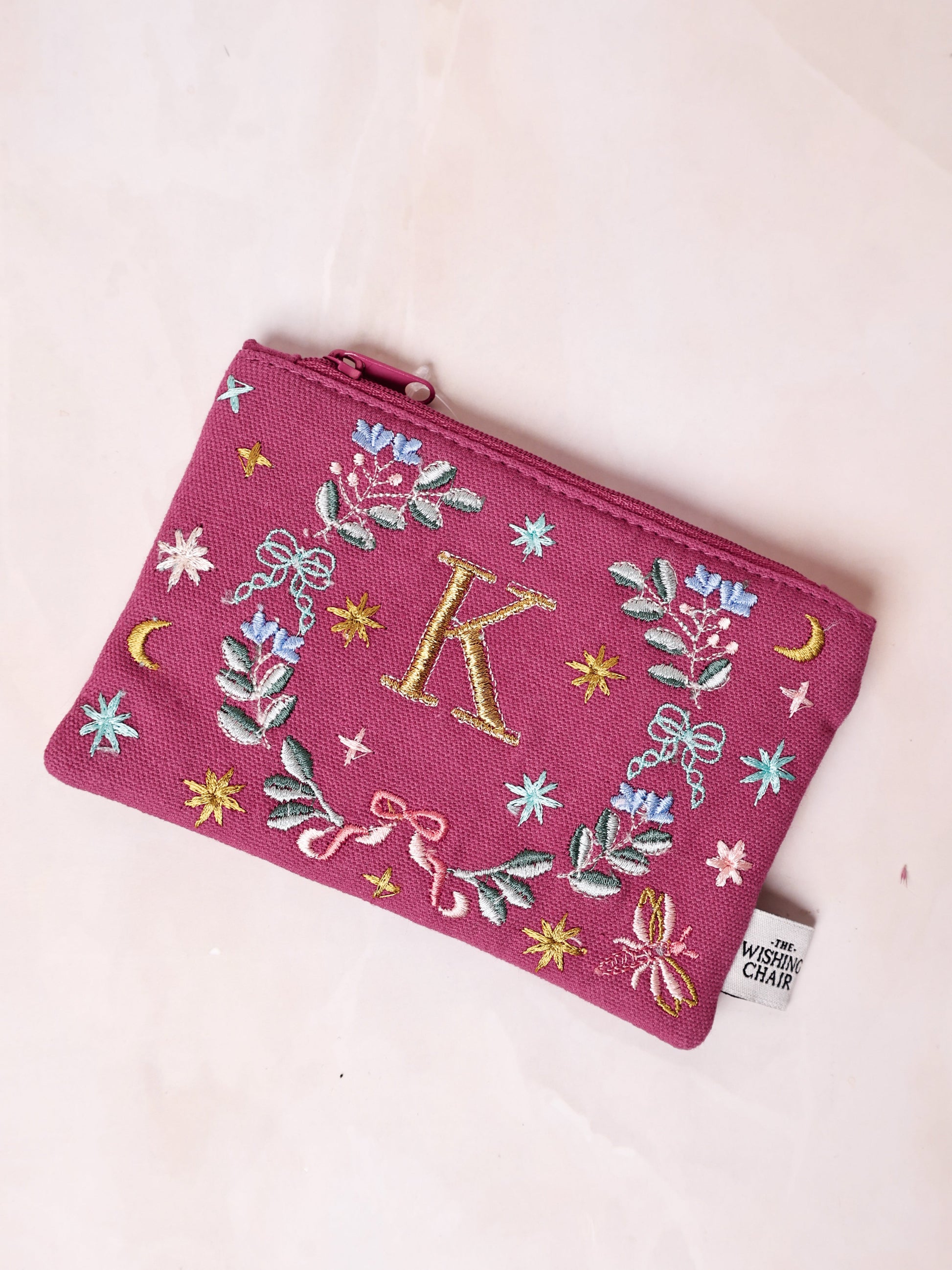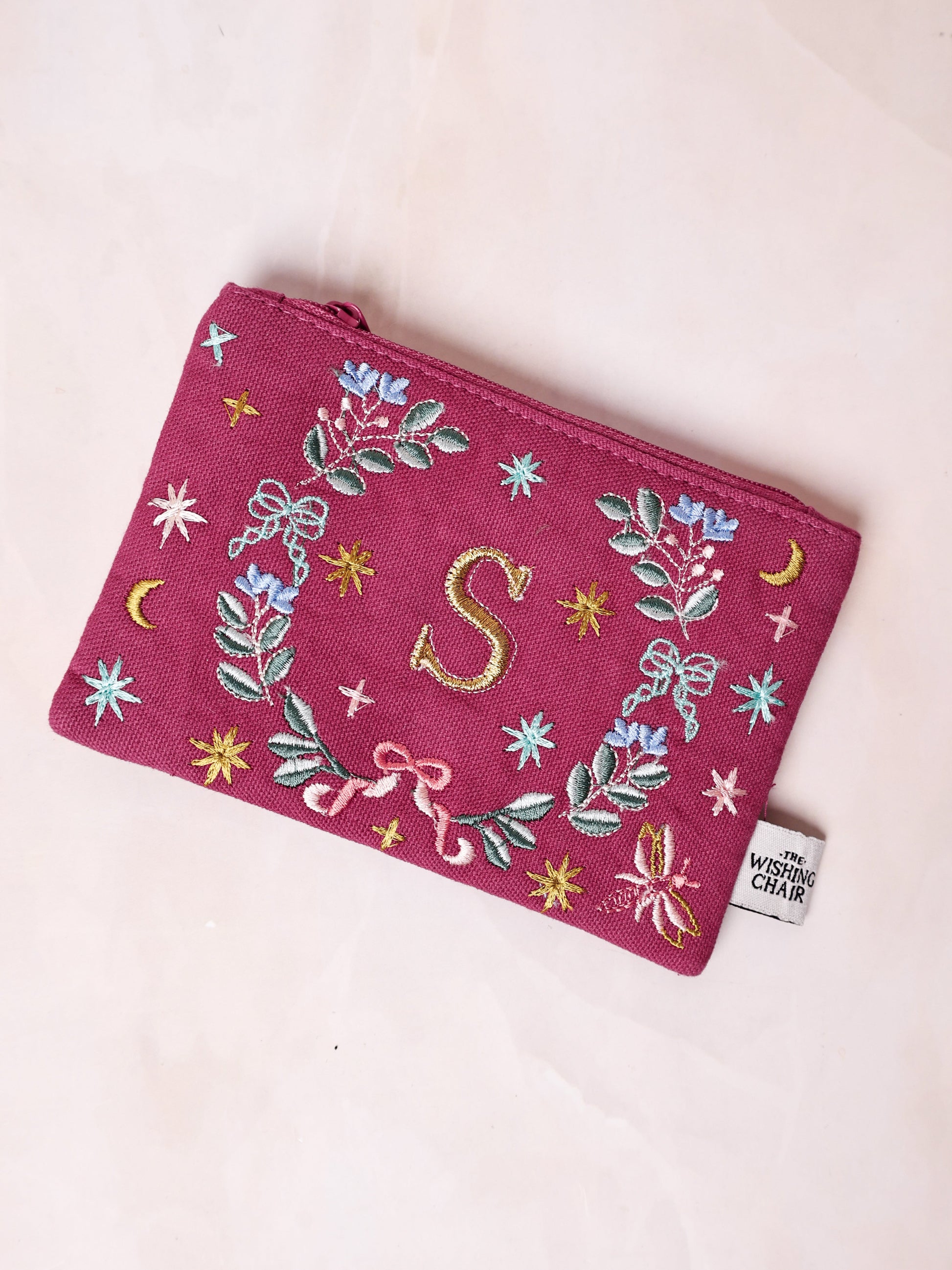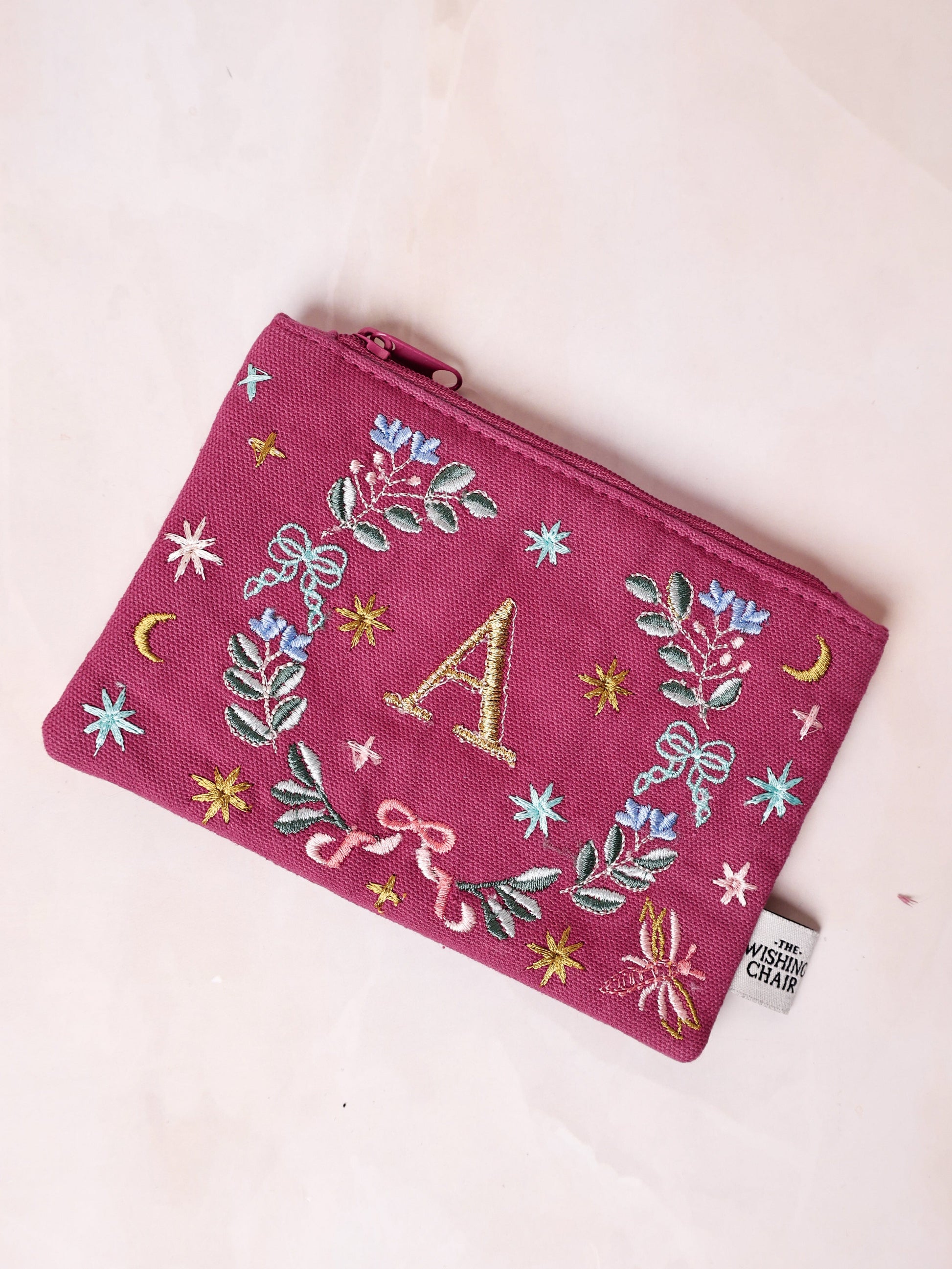 Embroidered magenta pouch with floral and celestial motifs, featuring the letter "A". Perfect for carrying small essentials. Designed by The Wishing Chair.