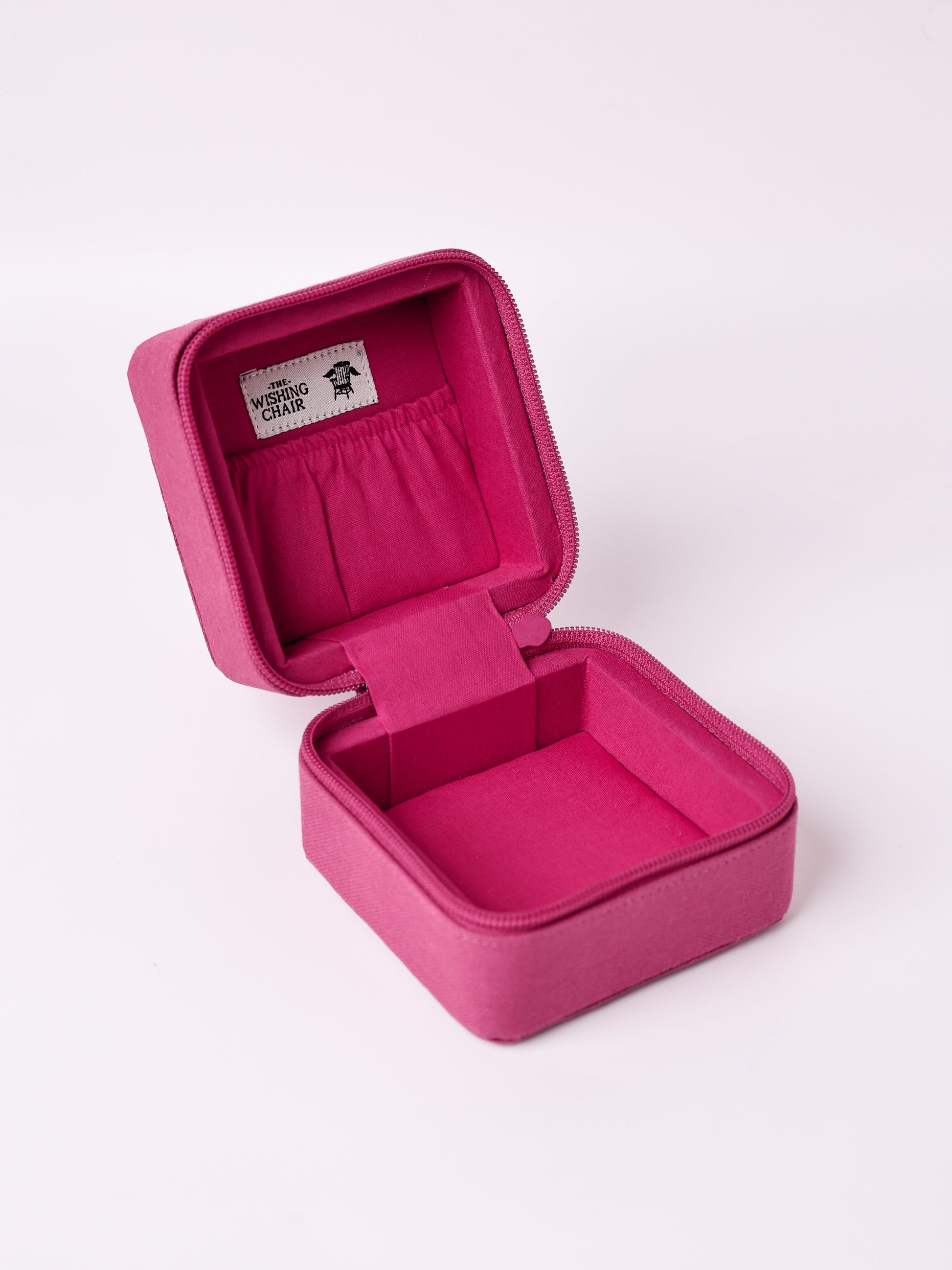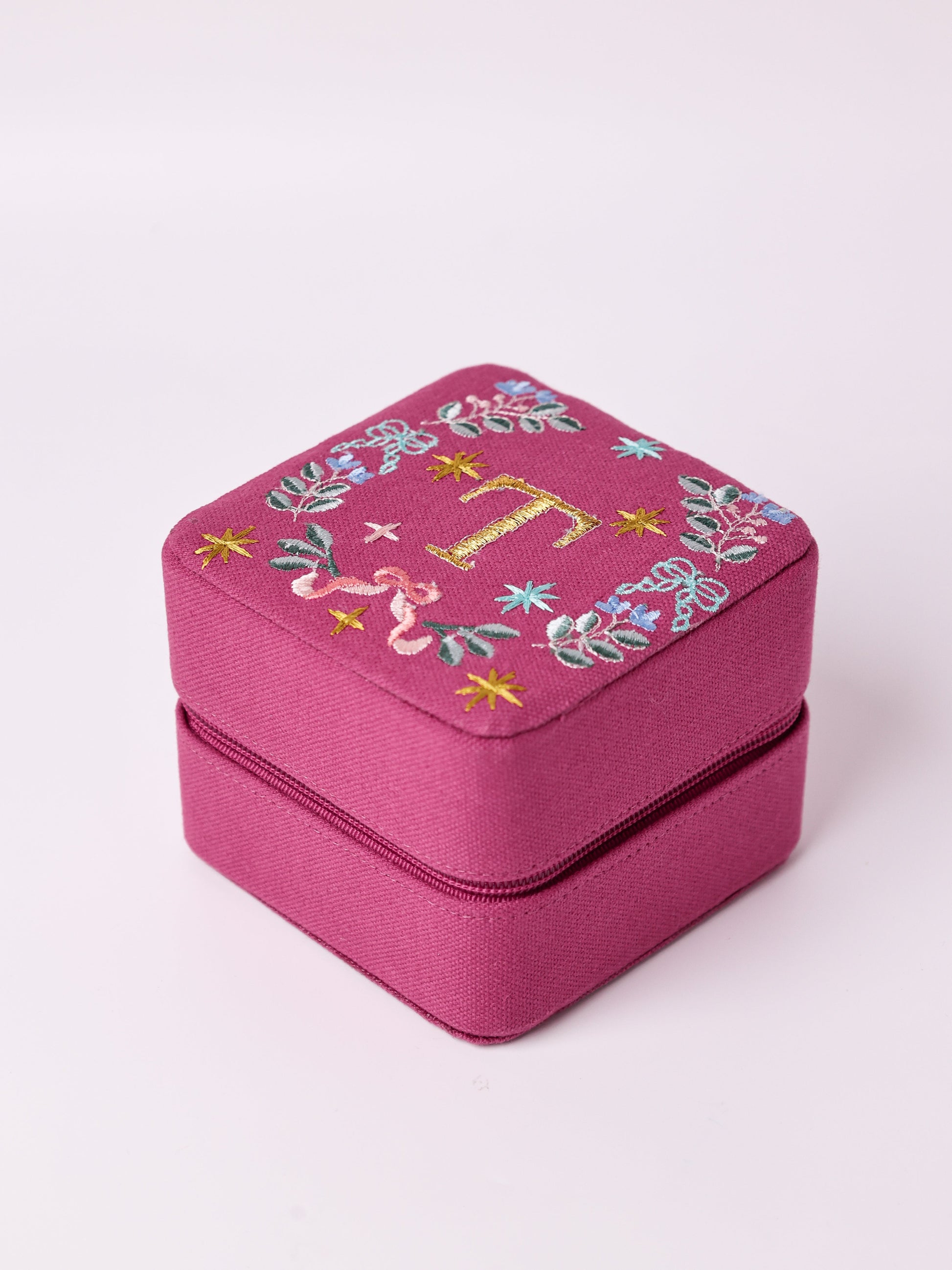 A beautifully crafted canvas mini jewelry box featuring delicate floral embroidery and a personalized monogram. Compact and travel-friendly, it¡¯s perfect for storing rings, earrings, and small keepsakes¡ªideal for gifting or everyday elegance. Designed by The Wishing Chair.